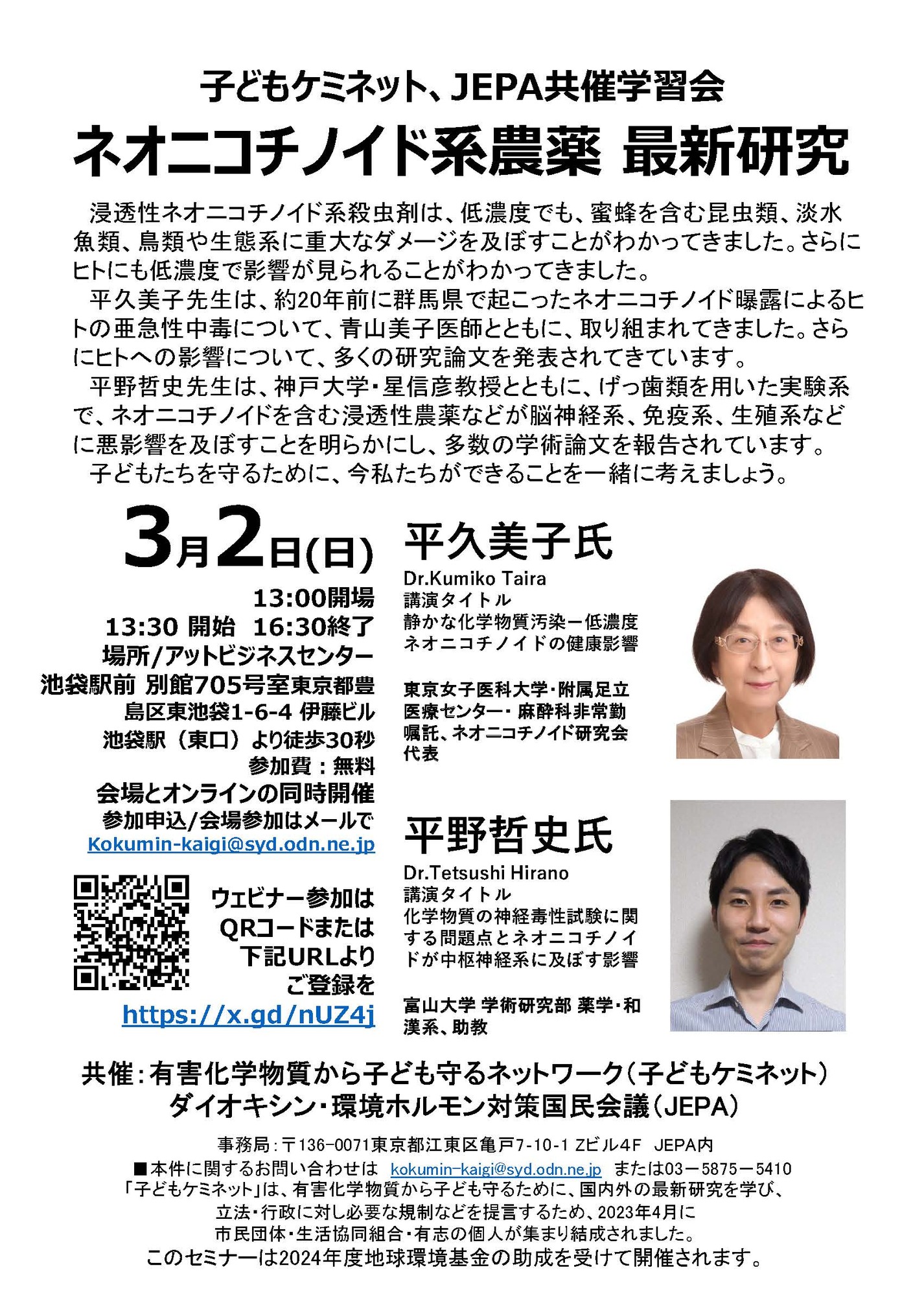2025年3月2日、アットビジネスセンターにて開催された有害化学物質から子ども守るネットワーク(子どもケミネット)、ダイオキシン・環境ホルモン対策国民会議(JEPA)共催学習会「ネオニコチノイド系農薬 最新研究」において、平野が講演を行いました。