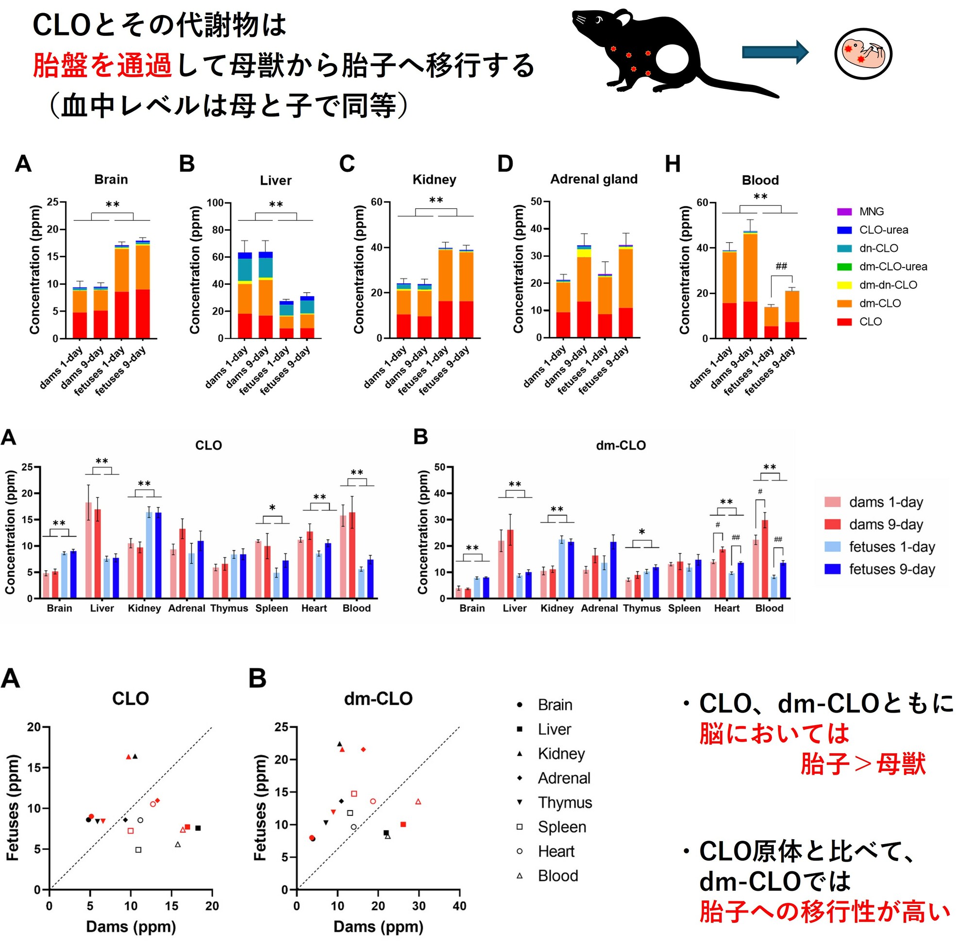 次に我々は授乳期の母マウスにCLOを投与し、母乳を介した次世代への移行を検証しました。その結果、母マウスが摂取したCLOは速やかに代謝されて母乳に移行することが明らかになりました。さらに血中よりも母乳中濃度の方が高いことから、CLOおよび代謝物は母体の血液から母乳に濃縮されて次世代に移行することが初めて分かりました[Shoda et al., 2023, Toxicol. Lett.]。