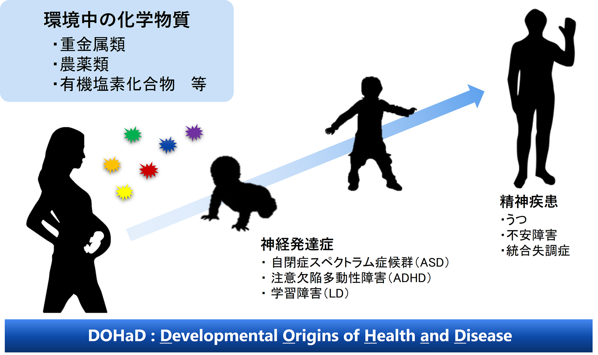 私たちの現代生活では、数万種類に及ぶ化学物質が日常的に使用されています。近年の疫学研究から、とくに妊娠期や胎児期における農薬や重金属、有機塩素化合物などへの曝露が、子どもの自閉スペクトラム症(ASD)、注意欠如・多動症(ADHD)、学習障害(LD)などの神経発達症、さらには成人期のうつ病や統合失調症といった精神疾患の発症リスクに関与することが明らかになってきました。こうした「発達期の環境要因が将来の健康に影響する」という考え方は DOHaD(Developmental Origins of Health and Disease) と呼ばれ、広く注目されています。