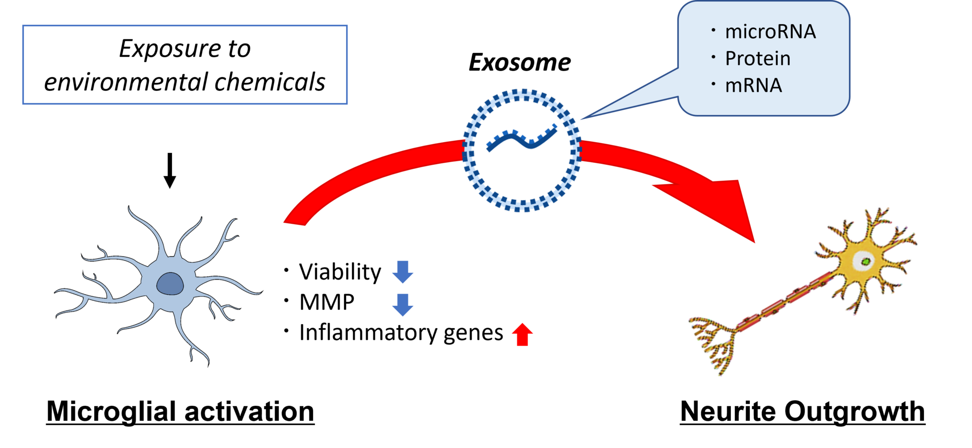 に取り組んでいます。実際に、ある農薬代謝物がミクログリアを活性化し、そこから放出されるエクソソームに含まれる特定のmicroRNAがニューロンに移行し、神経の保護や突起伸長に作用することを見出しました(投稿準備中)。